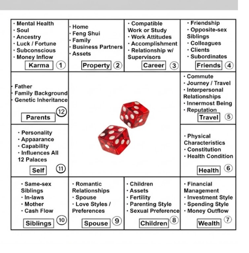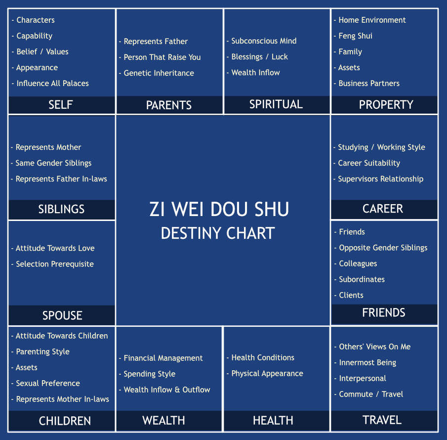 The 12 Palaces serve as the structural framework for Zi Wei Dou Shu (Purple Star Astrology), a sophisticated system of Chinese metaphysics used to map an individual’s life path. These palaces represent the twelve key areas of human experience, providing a “blueprint” of one’s destiny. Each palace represents a specific “department” or “sphere” of your life.